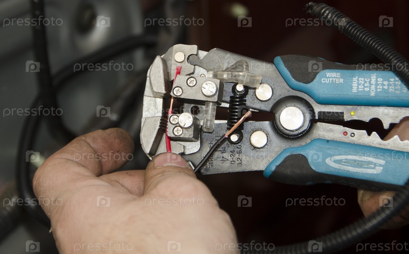 Зачистка и обкусывание электрического провода автомобиля с помощью голубых клещей