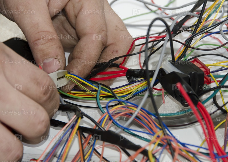 Автоэлектрик за работой, обкусывающий и обрезающий разноцветные электрические провода с помощью кусачек