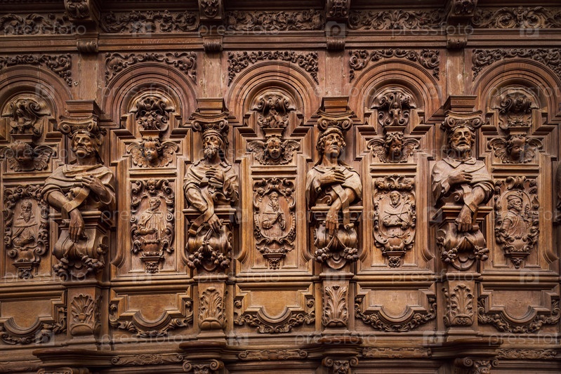 Деревянные выгравированные силуэты и лица в старом аббатстве Флореф