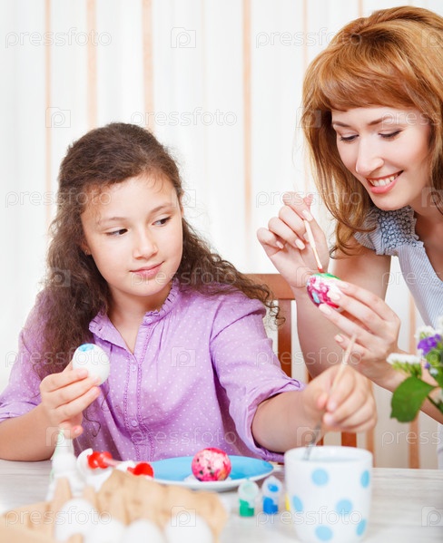 Мать и ее маленькая дочь красят пасхальные яйца