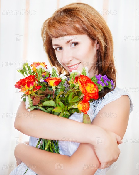 Счастливая молодая женщина с букетом цветов