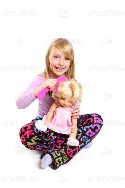 Девочка расчесывает волосы кукле, изолированная на белом фоне