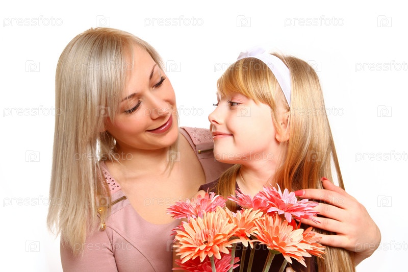 Мать и дочь с цветами смотрят друг на друга, изолированные на белом фоне