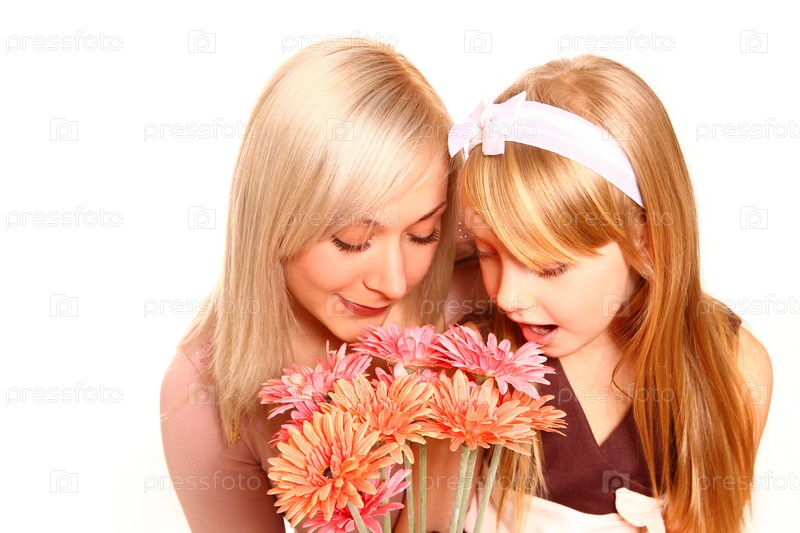 Мать и дочь нюхают цветы, изолированные на белом фоне