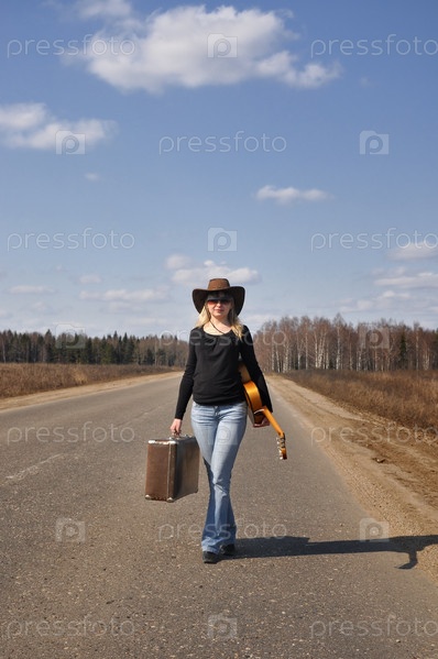 Девушка с гитарой идет по дороге