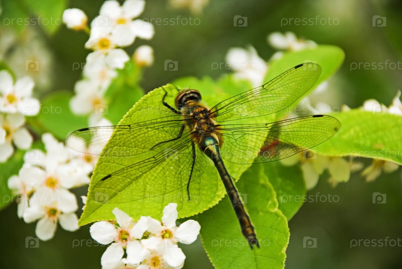 Стрекоза сидит на зеленом листе цветущего дерева