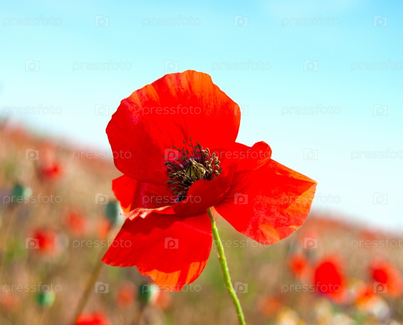 Красный мак на фоне макового поля