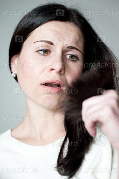 Девушка смотрит на кончики волос