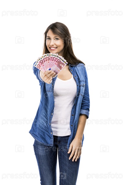 Женщина держит банкноты евро