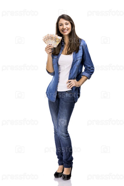 Женщина держит банкноты евро
