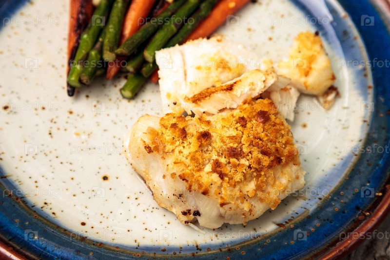 Морского окунь с сухарями и жареной спаржей и морковью