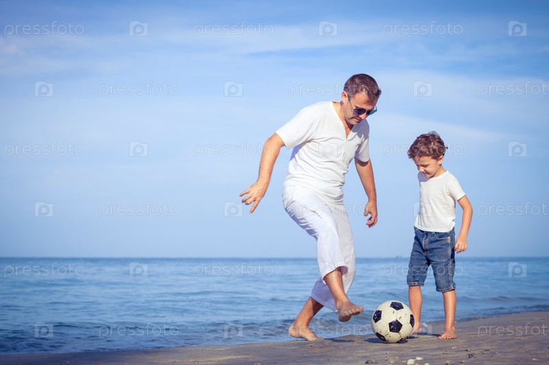 Отец и сын, играя на пляже в дневное время