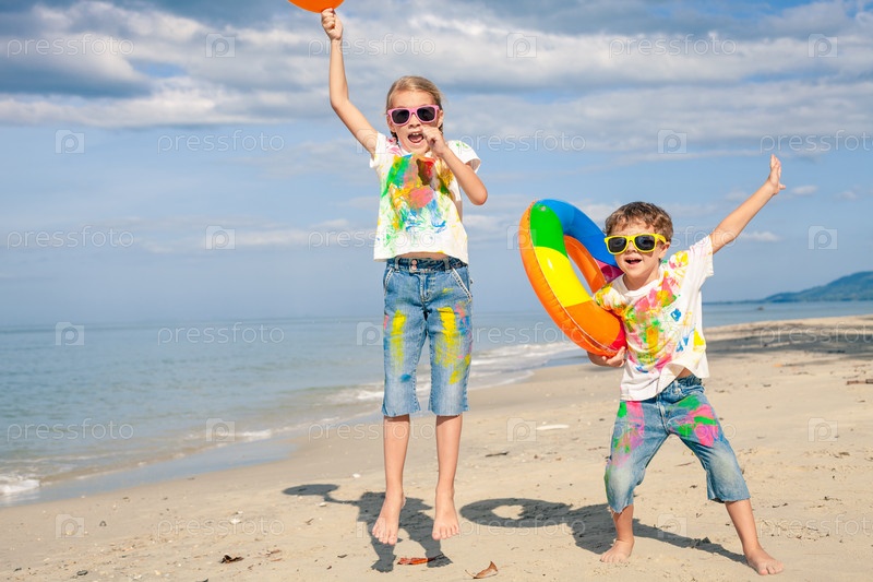 Счастливые дети, играющие на пляже