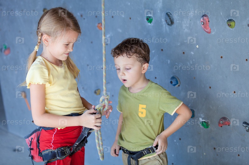 Брат и сестра, стоя рядом с каменной стеной для скалолазания