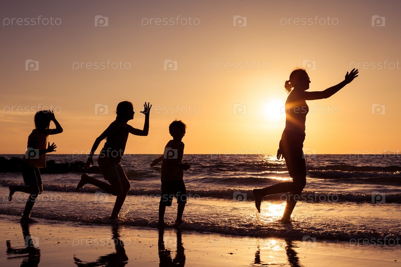 Мать и дети, играющие на пляже во время заката