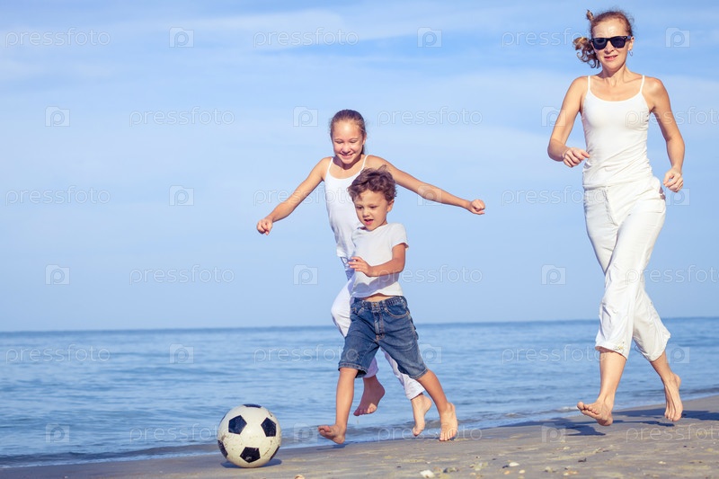Мать и дети, играющие на пляже