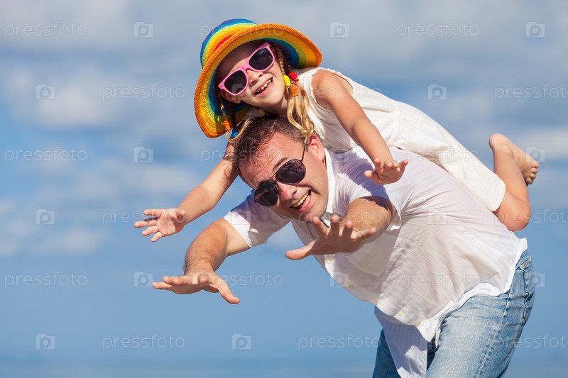 Отец и дочь, играя на пляже