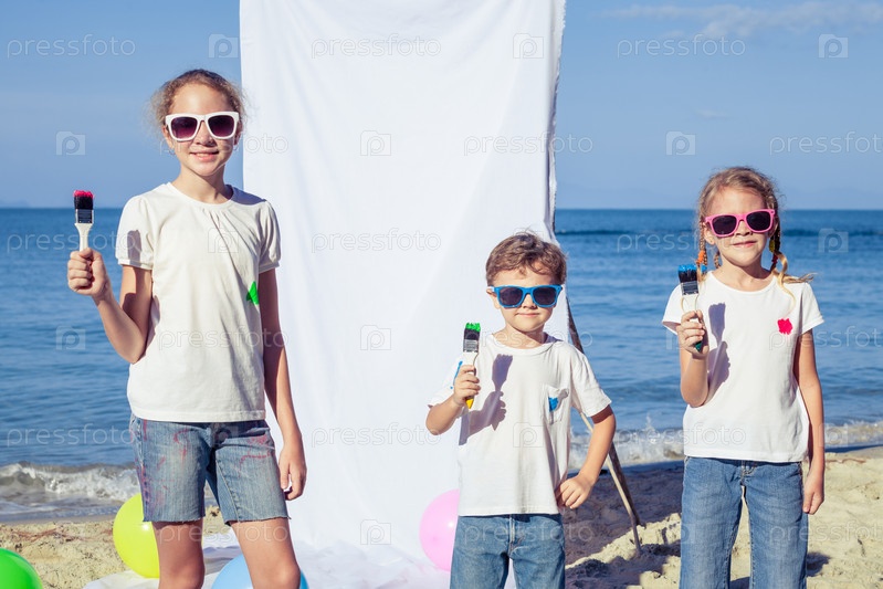Две сестры и брат, играя на пляже