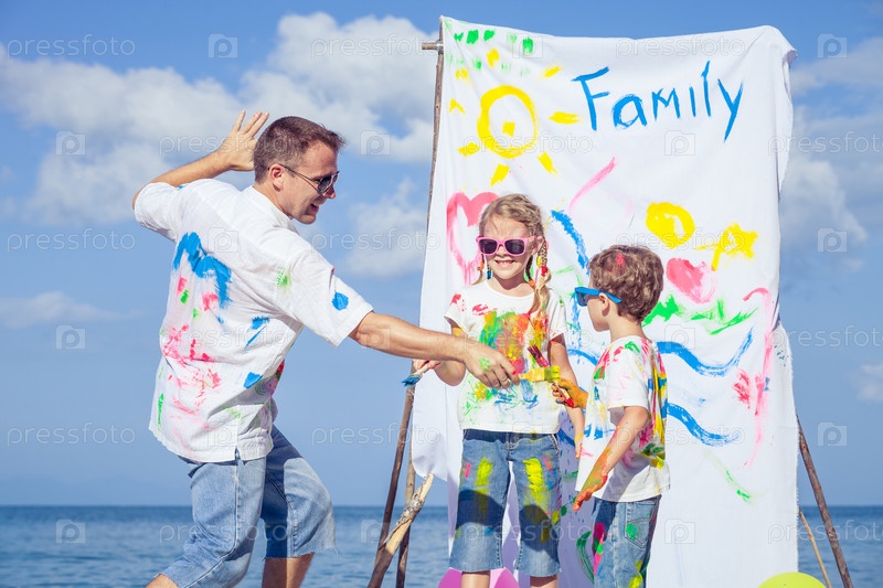 Отец и дети, играющие на пляже