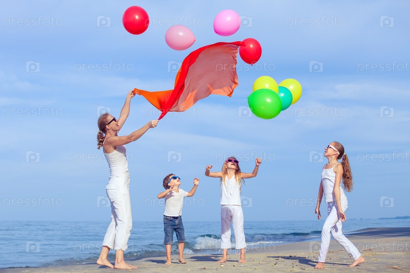 Мать и дети, играющие на пляже в дневное время