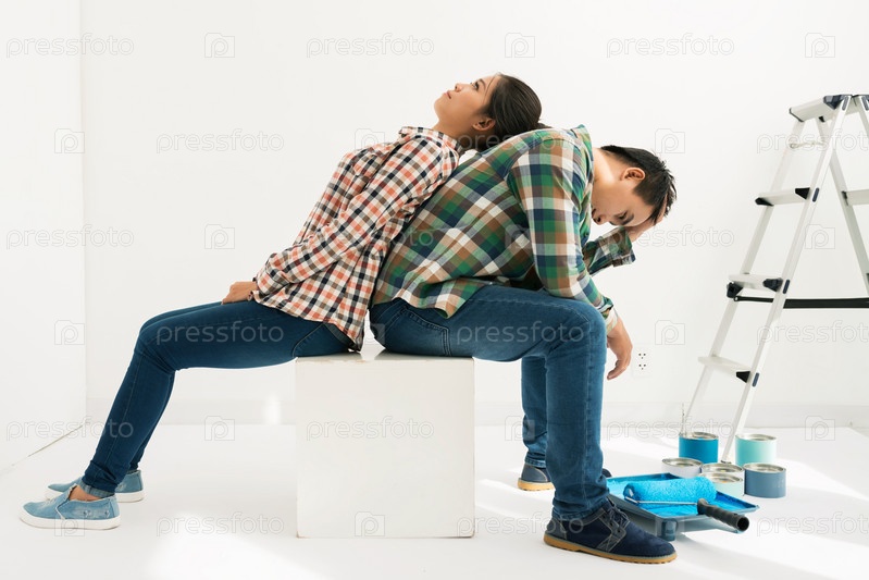 Усталая молодая пара, сидя на полу после ремонта комнаты