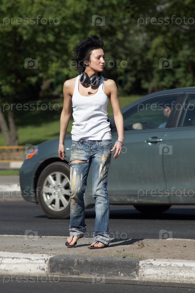 Девушка с наушниками у дороги