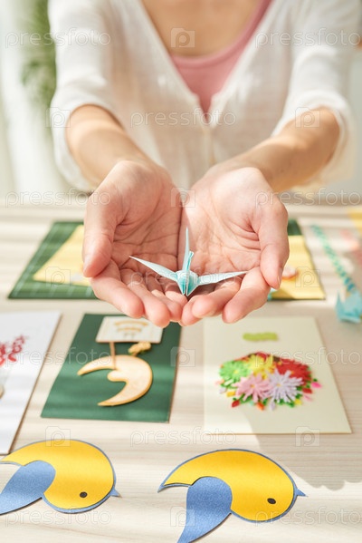 Женские руки с бумажным журавликом