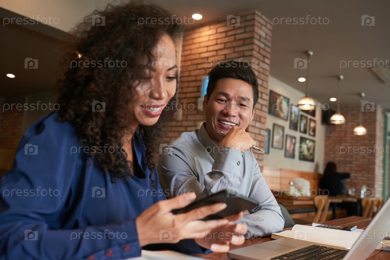 Улыбающиеся коллеги в кафе