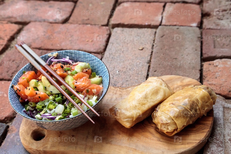 Сырой лосось с рисом и овощами