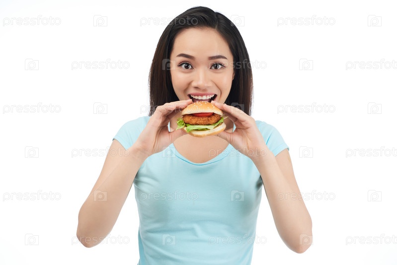 Женщина ест куриный бургер
