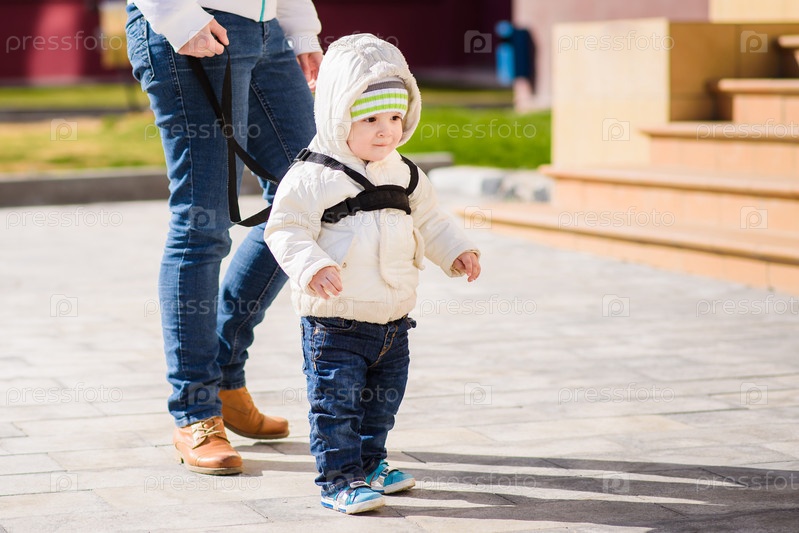 Мама страхует своего ребенка во время прогулки