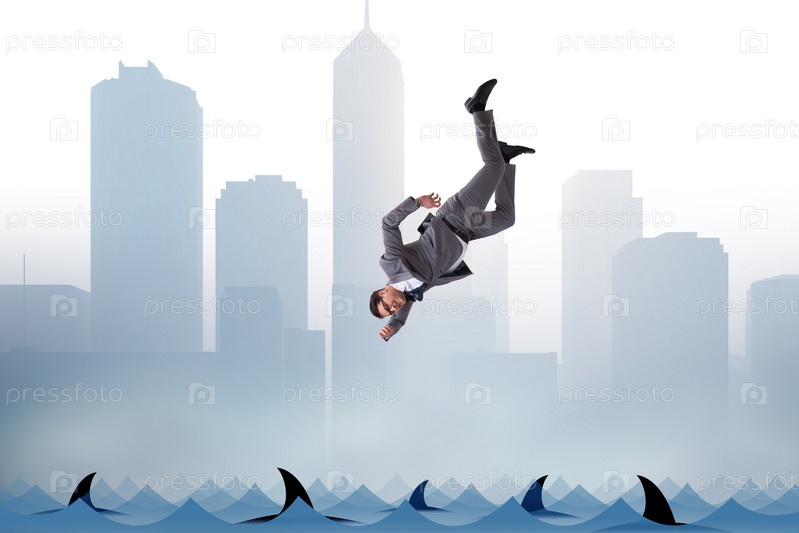 Бизнесмен падает в море с акулами
