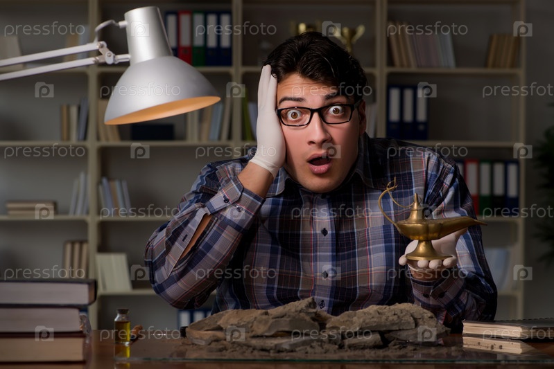 Археолог работает поздно вечером в офисе