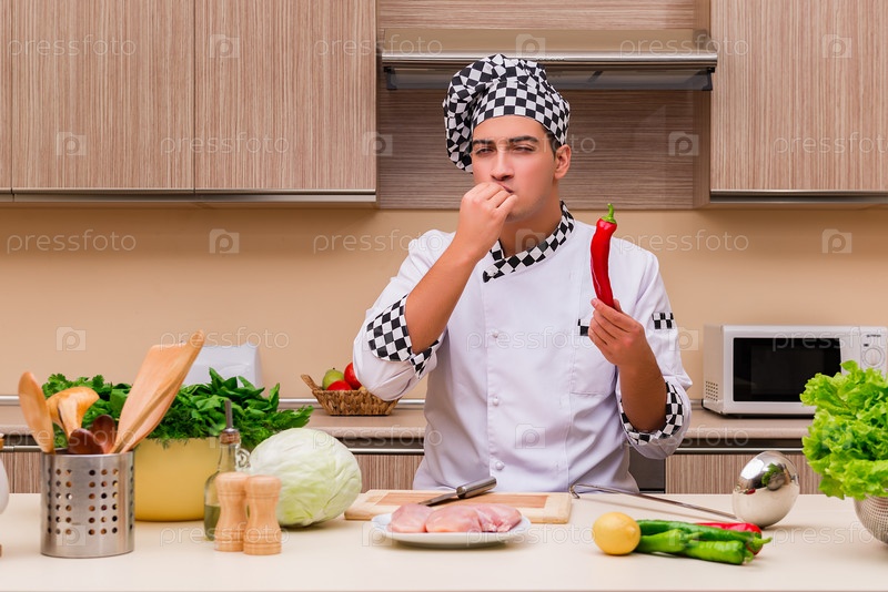 Молодой повар работает на кухне