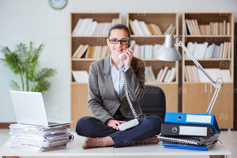 Занятой предприниматель, сидя на столе в офисе