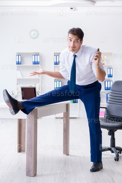 Молодой бизнесмен делает растяжку на рабочем месте