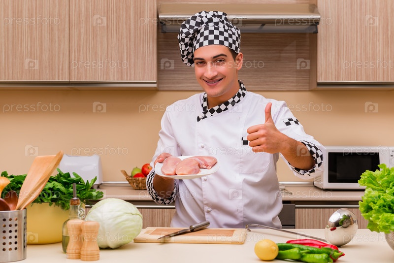 Молодой повар работает на кухне
