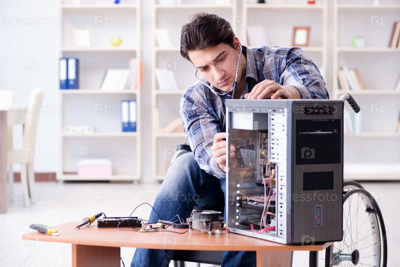 Инвалидов на инвалидной коляске ремонтирует компьютер