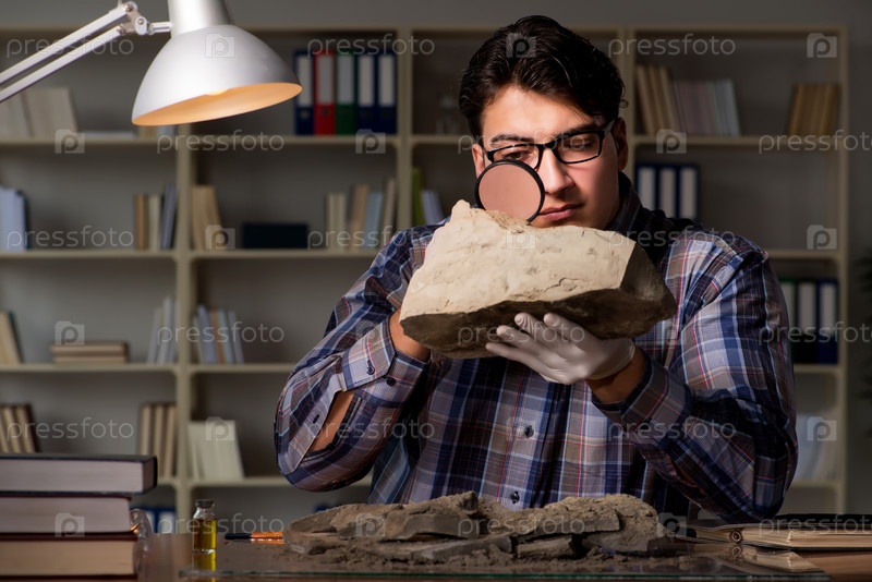 Археолог работает поздно вечером в офисе
