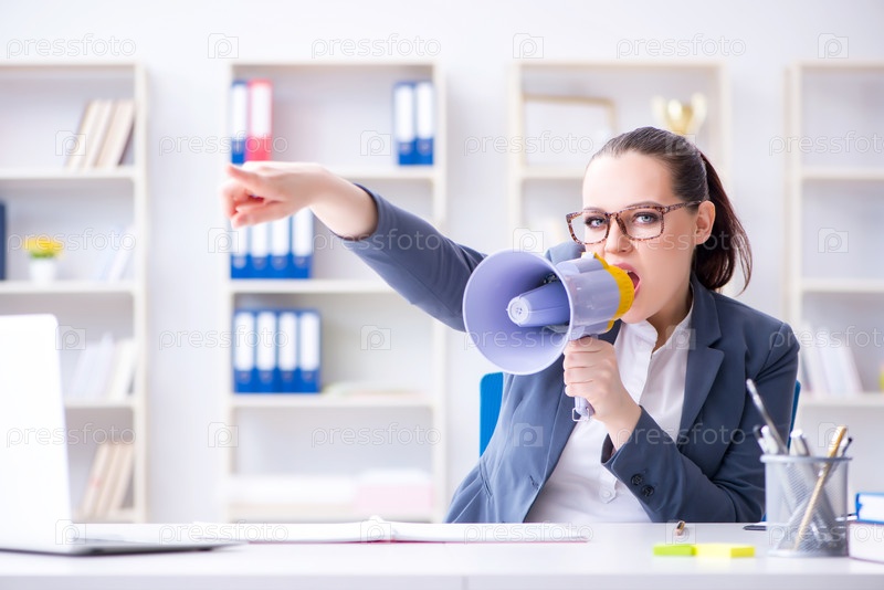 Злой бизнесмен кричит с громкоговорителем в офисе