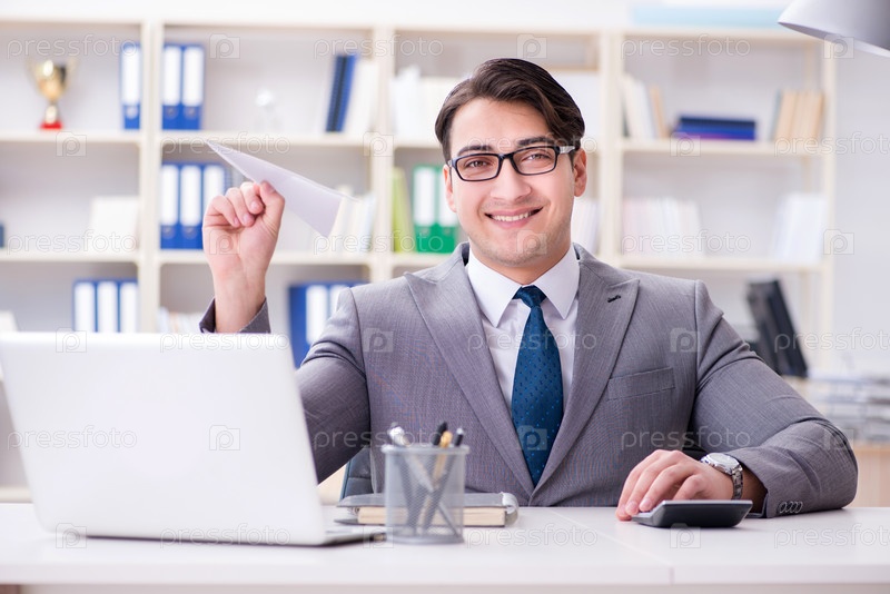 Бизнесмен с бумажным самолетиком в офисе