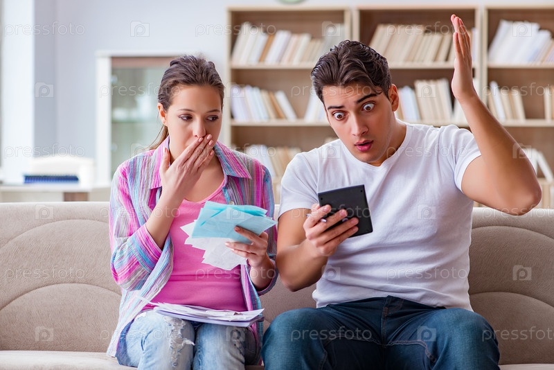 Молодая семья обсуждает семейные финансы