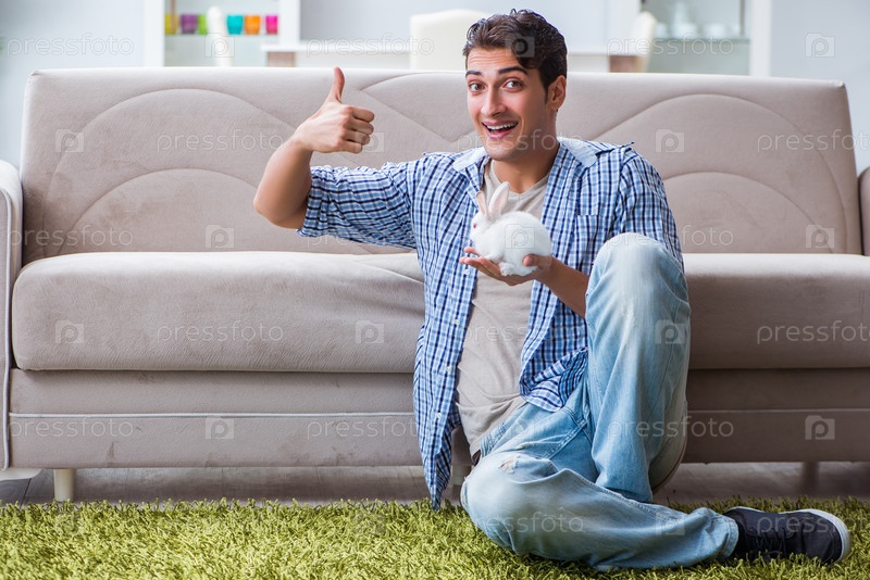 Молодой человек играет с домашним животным