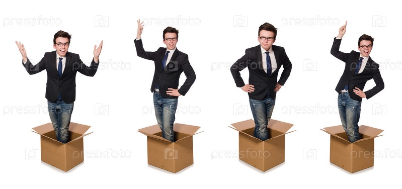 Забавный человек с коробками на белом