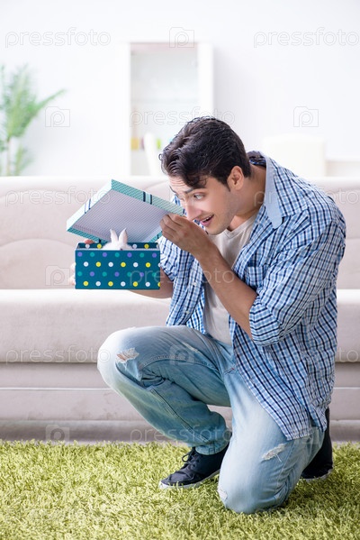Молодой человек получил кролика в качестве подарка на день рождения