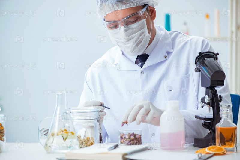 Химик, смешивая духи в лаборатории