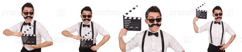 Усатый человек с хлопушкой
