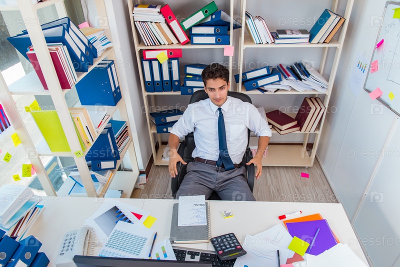 Бизнесмен, работающий в офисе с грудой книг и бумаг