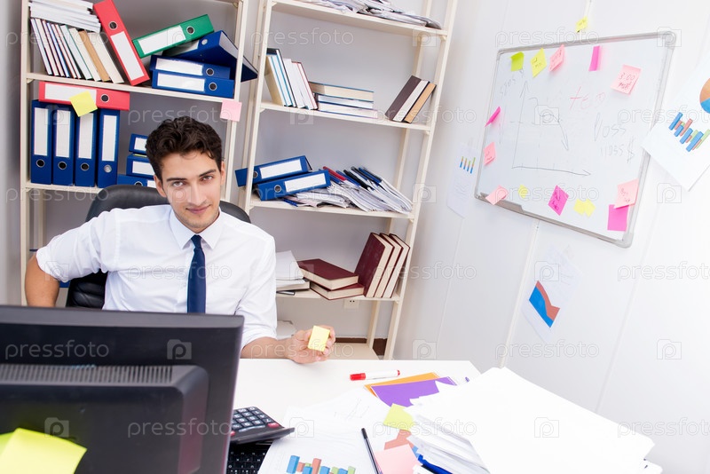 Бизнесмен, работающий в офисе с грудой книг и бумаг
