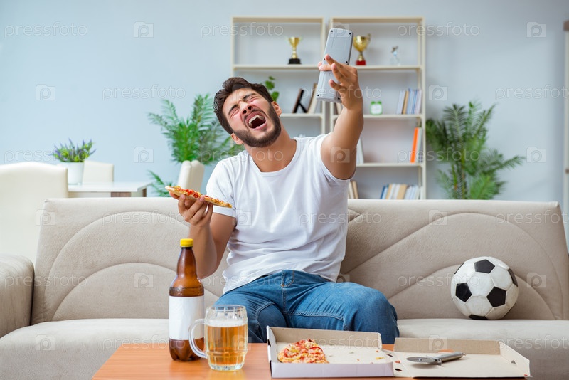 Человек ест пиццу с пивом